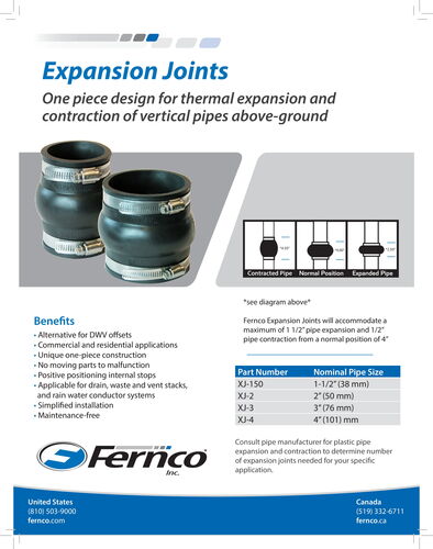 Fernco’s one-piece expansion joints allows thermal expansion and contraction of drain, waste and vent pipes and inside rain water conductor systems. Eliminating costly offsets normally used to accommodate expansion and contraction, this coupling is an ideal solution for vertical pipe installations.